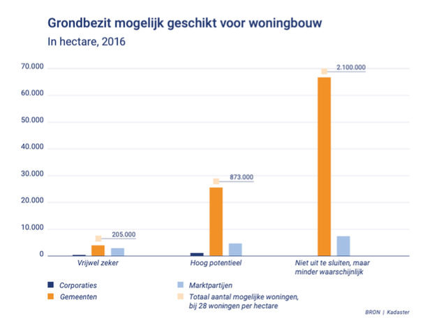 Een overheid die zowel bepaalt wie wat waar mag bouwen én zelf actief grond inkoopt opereert op gespannen voet met een ruimtelijke ordening die het publieke belang dient. Constante inkomsten voor het grondbedrijf zijn in veel gemeenten veel belangrijker dan het bouwen van voldoende, betaalbare nieuwe woningen. Hierdoor hebben gemeenten, als marktspelers, vaak een afwachtende houding: bij stijgende huizenprijzen worden de grondopbrengsten immers automatisch hoger, bij dalende huizenprijzen wachten gemeenten liever op betere tijden. Dit terwijl de maatschappij juist nu schreeuwt om veel betaalbare woningen. De realiteit is dat veel gemeenten monopolisten geworden zijn. Ze zitten samen op een enorme berg grond; 96.000 hectare waarvan een derde (zeer) veel potentie heeft voor woningbouw: goed voor minimaal 800.000 woningen (zie figuur 1). 80% van deze grond ligt buiten de bebouwde kom.