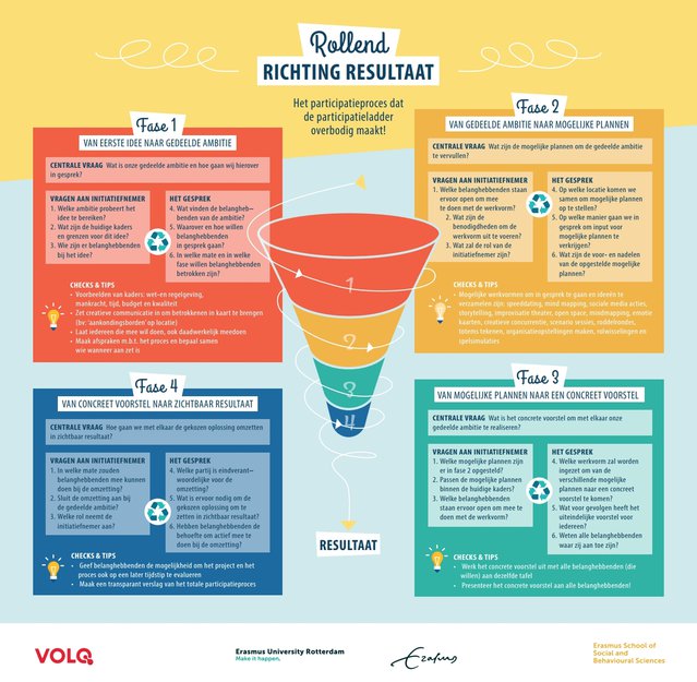 Genoeg redenen om te werken aan een alternatief voor de participatieladder. Met die ambitie hebben we studenten Bestuurskunde van de Erasmus Universiteit Rotterdam aan het werk gezet. Via individuele gesprekken met bewoners, ondernemers, vertegenwoordigers van maatschappelijke organisaties en ambtenaren, aangevuld door creatieve sessies, zijn ze tot een nieuwe procesaanpak voor participatie gekomen. Dit is een iteratief procesmodel waarmee initiatiefnemers de participatie kunnen organiseren van eerste idee, via een gedeelde ambitie en verschillende plannen, tot uiteindelijk een zichtbaar resultaat.