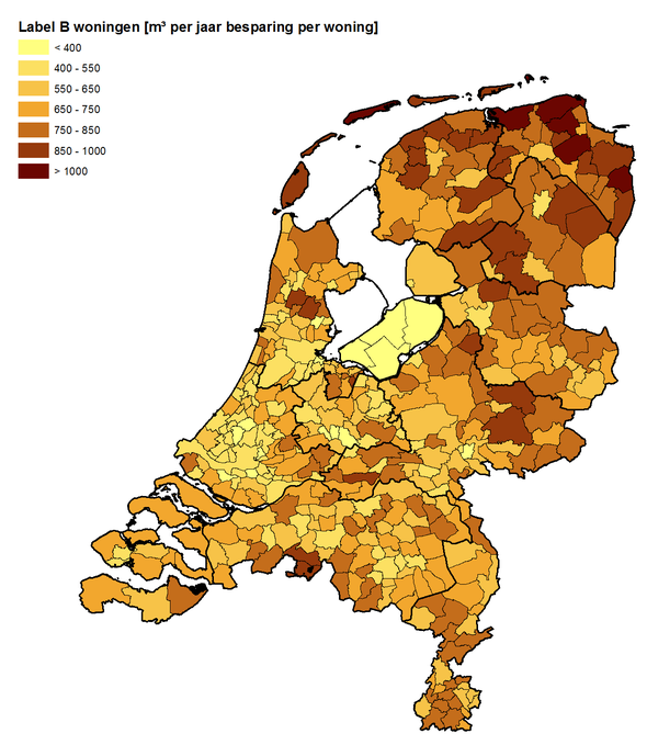 In de eerste afbeelding wordt de besparing zoals berekend met een model (op basis van woningtype en bouwjaar) bij een stap naar label B weergegeven. In het oosten van het land staan gemiddeld genomen grotere woningen die ook vaker vrijstaand zijn, en er is minder gestapelde bouw. Dit leidt tot een hoger gasverbruik per woning (en dus ook een grotere besparing per woning bij isolatie) dan bijvoorbeeld in de grote steden, waar woningen over het algemeen kleiner zijn en gestapelde bouw vaker voorkomt. Als alle woningen in Nederland naar label B worden gebracht, kan er 45% van het totale huidige verbruik van energie in woningen bespaard worden. Let op: er is in deze analyse enkel gekeken naar de technische potentie zonder rekening te houden met een acceptabele terugverdientijd.