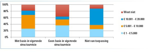 ‘Figuur 3: Kostenverhaal per woning naar aandeel gemeenten in relatie tot het hebben van een vigerende structuurvisie’ (bron: Stec Groep)