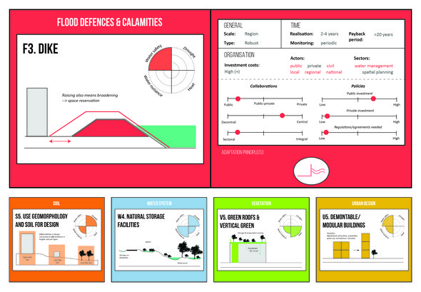 Vervolgens moeten de relevante adaptatiemaatregelen geïdentificeerd worden (stap 3). Om de grote hoeveelheid aan mogelijke maatregelen te structureren zijn ‘maatregelen-tegels’ ontwikkeld (Figuur 5), die zijn onderverdeeld in vijf domeinen: waterkeringen & calamiteiten, bodem, water, vegetatie, en stedelijk ontwerp (bebouwing). De tegels bevatten praktische informatie over de samenhang met andere klimaatvraagstukken, complexiteit en schaalniveau. En informatie over de benodigde organisatie, zoals welke partijen nodig zijn om de maatregel tot uitvoering te brengen. De tegels kunnen helpen om geschikte maatregelen voor het gebied te selecteren die elkaar logischerwijs in de tijd opvolgen.
