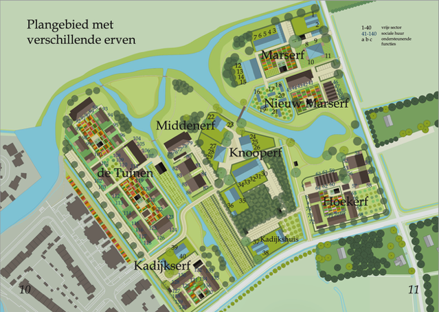 Elk erf heeft een hoofdhuis – vaak van steen – en een houten schuur met (schijn)kap. De meeste andere woningen zijn van hout en komen uit de fabriek. De woningen en collectieve tuinen beslaan een derde van het gebied, twee derde bestaat uit openbaar groen en water. Landschappelijk wonen betekent in dit geval zo’n 18 woningen per hectare. De infrastructuur is minimaal: de wegen en parkeerplaatsen zijn gemaakt in halfverharding en er zijn geen lantaarnpalen.