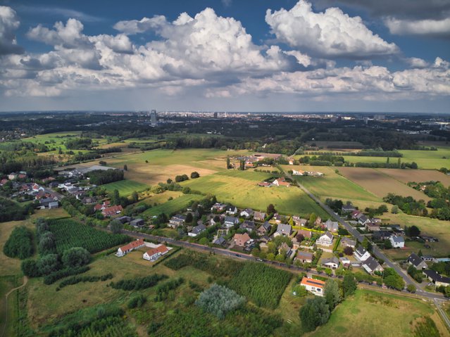 ‘De Pinte, België, augustus 2020: Luchtfoto van de buitenwijken van Gent in De Pinte, woonwijk gemengd met landbouw’ door Kristof Bellens (bron: Shutterstock)