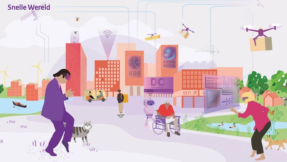 Snelle Wereld is het digitale scenario. In deze variant staat het online leven centraal en dat betekent dat Nederland sociaal en ruimtelijk gezien sterk fragmenteert. Er ontstaan verschillende leefstijlgroepen die in sociale bubbels bij elkaar leven, maar tussen de bubbels is er niet veel contact. De focus op thuiswerken heeft veel invloed op de ruimtelijke indeling van het land. Wonen op de duurste, drukste plekken is niet meer nodig en dus wordt de woningbouw veel meer over het land verspreid.
