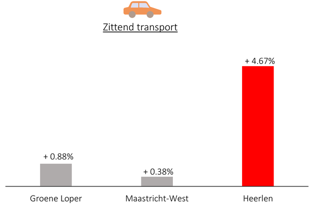 Ten tijde van de eerste nameting, toen de Groene Loper enkele maanden geopend was, vonden we geen significante veranderingen in de totale hoeveelheid fysieke activiteit bij de inwoners van Maastricht. Ook vonden we geen veranderingen in de totale hoeveelheid actief transport. Echter, we vonden dat in de controlegroep in Heerlen het aandeel zittend transport, bijvoorbeeld met auto, bus of scooter, gedurende de twee jaar tussen de nulmeting en eerste nameting significant toenam, terwijl dat niet zo was voor de groepen in Maastricht (afbeelding 5). De Groene Loper leek voor de groepen in Maastricht een toename in zittend transport te voorkomen.